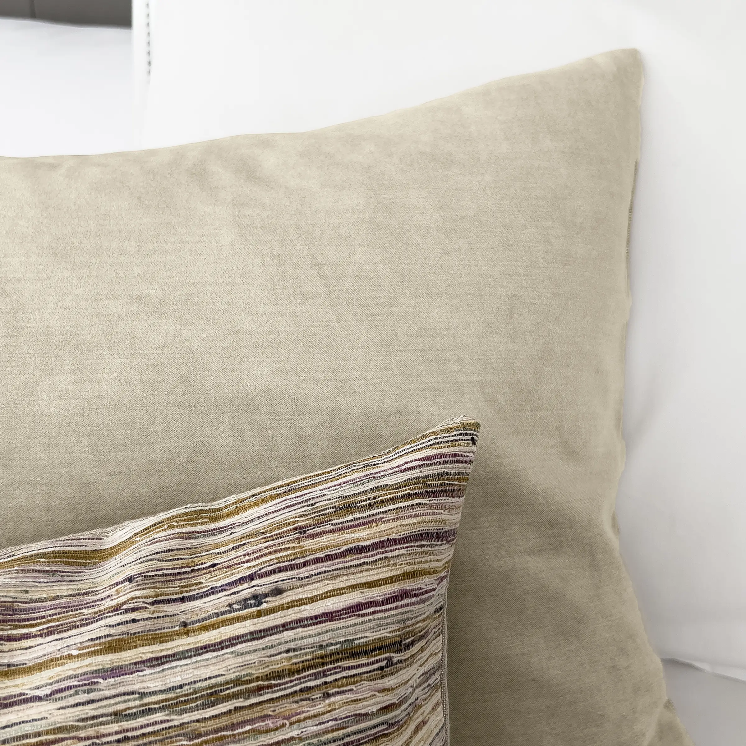 Het zachte, kortpolige velours aan de voorzijde geeft het kussen een warme, rijke touch, terwijl de natuurlijke linnen achterzijde met zilverkleurige coating zorgt voor een subtiel glanzend contrast. Deze combinatie van zachte, warme textuur en verfijnde, koele glans creëert een elegant spel tussen comfort en luxe — kenmerkend voor de hoogwaardige materiaalkeuzes binnen de Mrs.Me-collecties.